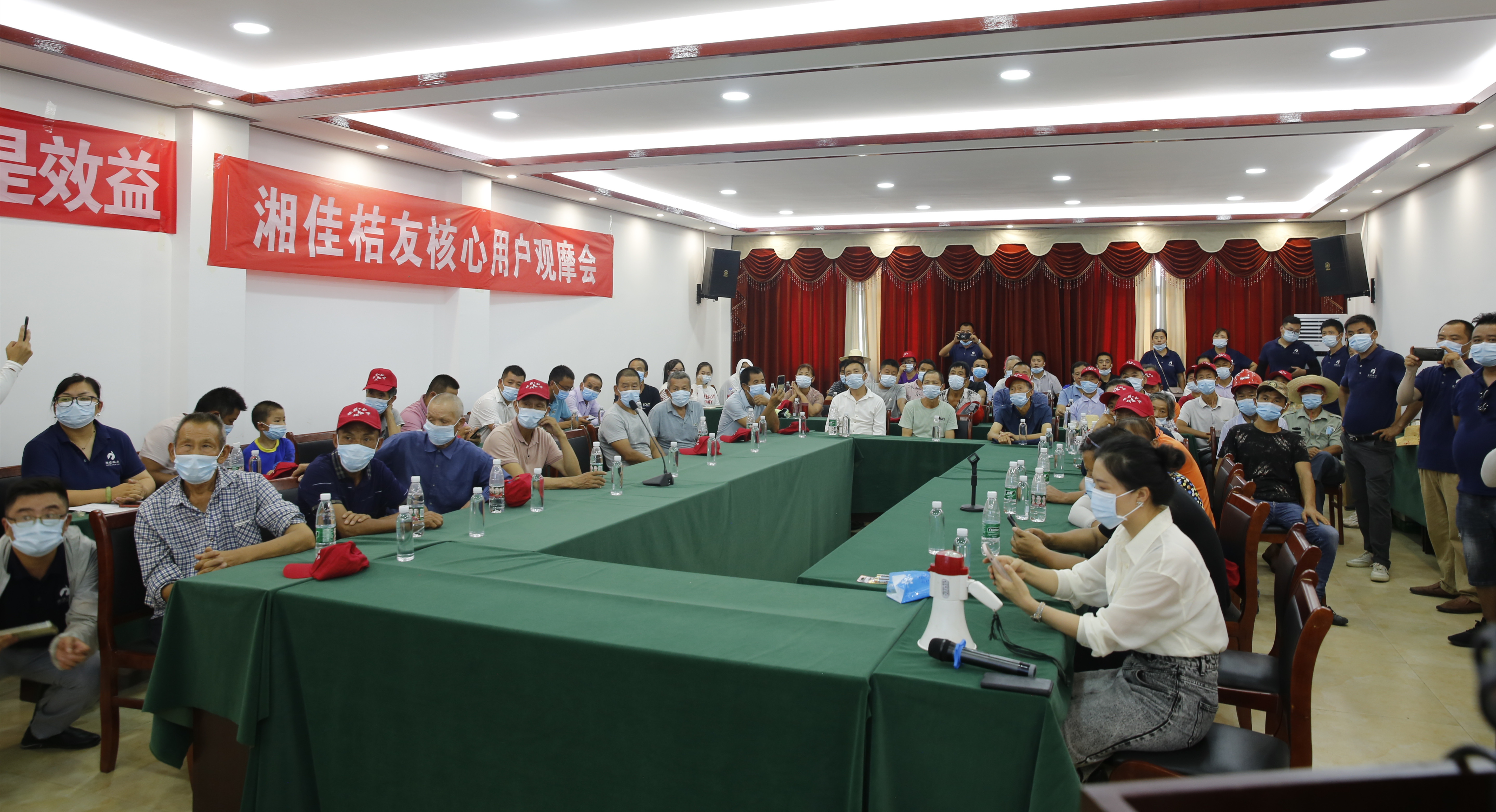 接著,種植大戶們來到會議室,觀看湘佳有機肥宣傳片。湘佳現代農業總經理饒天玉進一步介紹了湘佳有機肥,湘佳橘友副總經理陳凌嬌也介紹了公司的發展規劃以及下一階段柑橘培管方案。